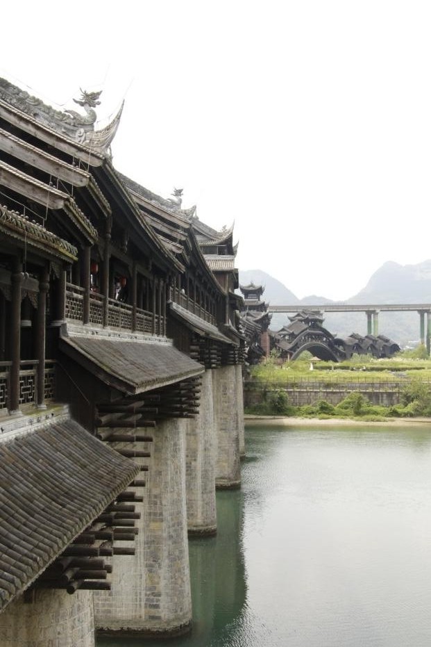 实践团成员们还走上了“世界第一风雨廊桥”——濯水风雨廊桥,亲身体验这座古老建筑的魅力。风雨廊桥不仅是交通要道,更是黔江地区文化的象征。在桥上,成员们遇到一对来此旅游的母子,孩子正指着廊桥木柱上雕刻的西兰卡普纹样好奇提问,母亲看着手机上查阅的资料告诉孩子说:“这其实是土家族的织锦非遗,以前姑娘们会把这样的图案绣在背扇上。”这番对话让实践团成员眼前一亮,纷纷上前与母子交流,得知他们正是为了体验黔江非遗而来。